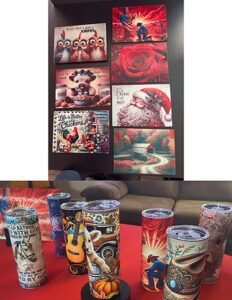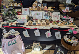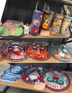 Types of goods: mental health and affirmation bracelets and swag, as well as Colorado swag and stickers and lots of Christmas sublimated items (ornaments, dish towels, etc.)