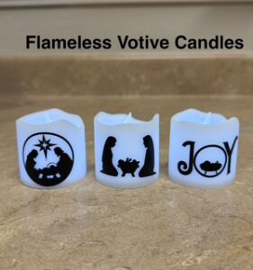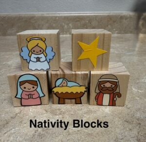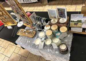 Types of goods: hair bows, several different styles of Nativity decor (including candles, wooden blocks, and sun catchers), small bags & pouches